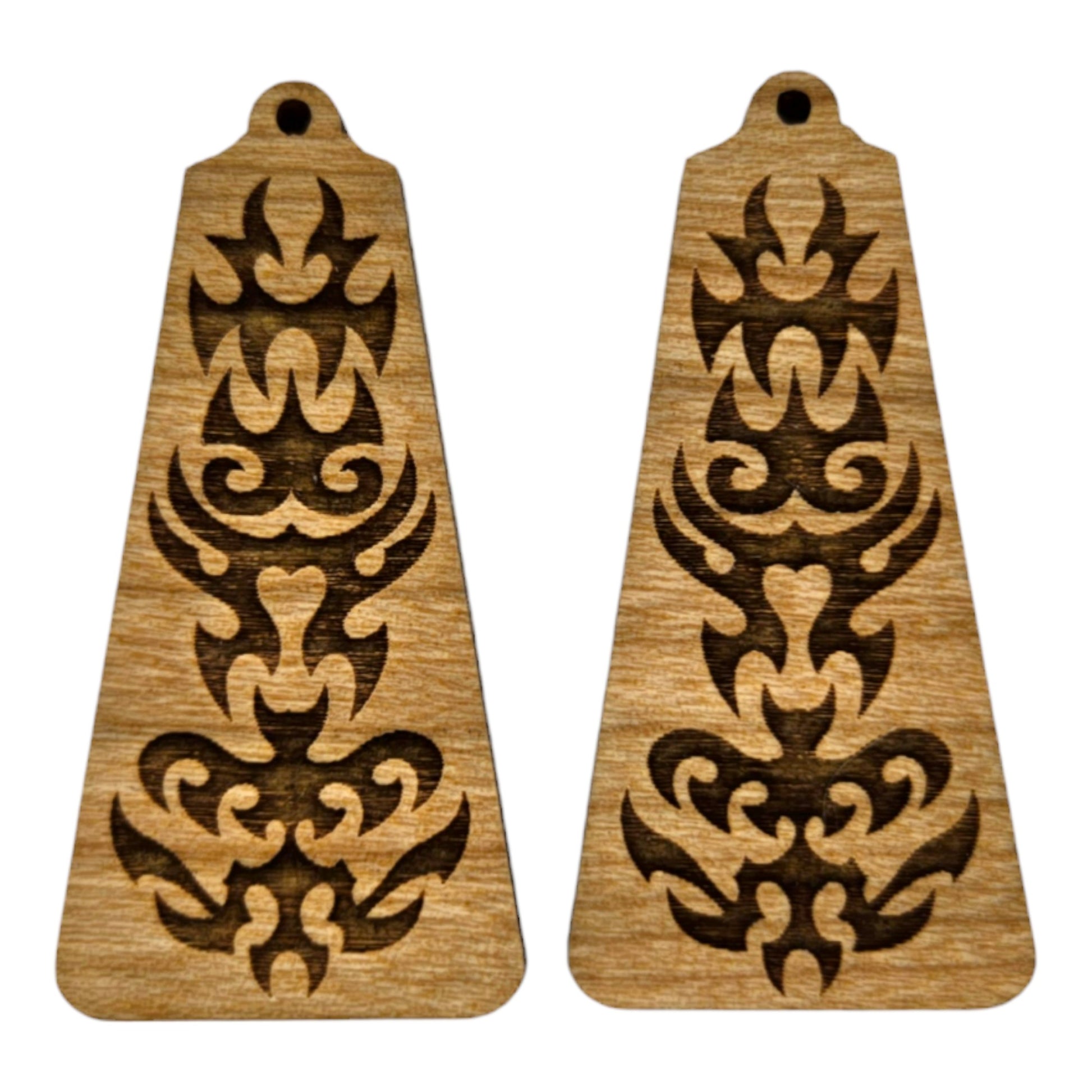 Wood earrings in a cutout long triangle shape engraved with an Asian or perhaps Tribal type design handcrafted in the USA in a small father and daughter wood shop in Northern California.