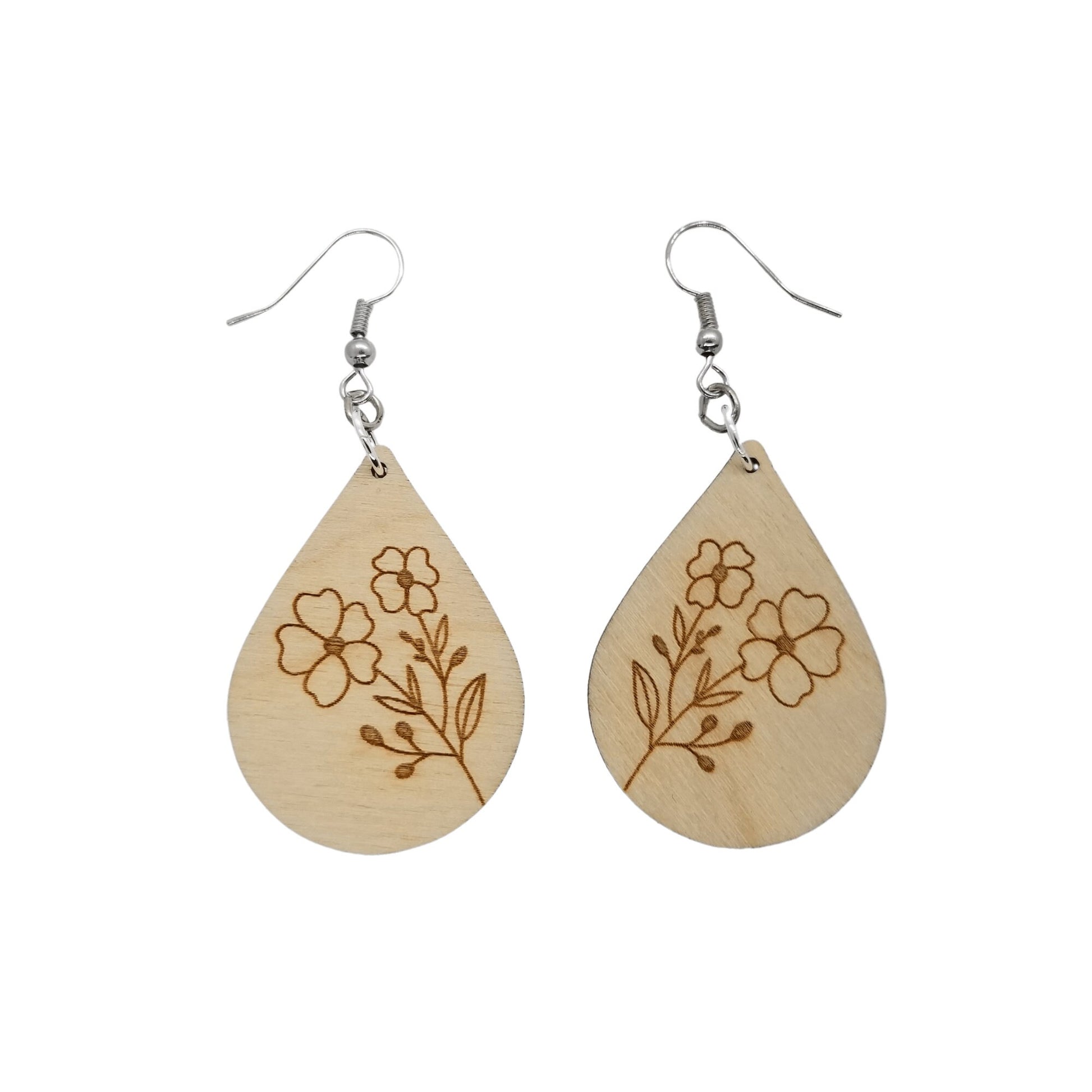 Wood earrings in a teardrop shape engraved with 2 Flowers, Buds, and Leaves handcrafted in the USA in a small father and daughter wood shop in Northern California.