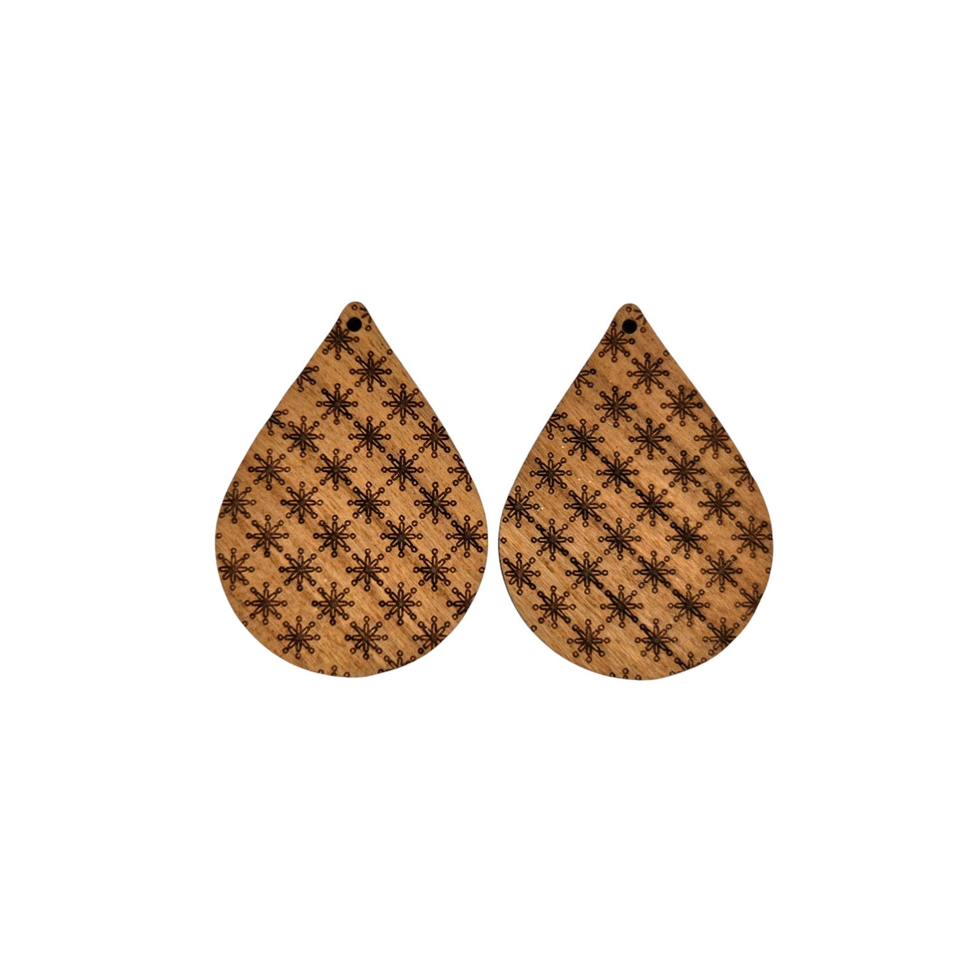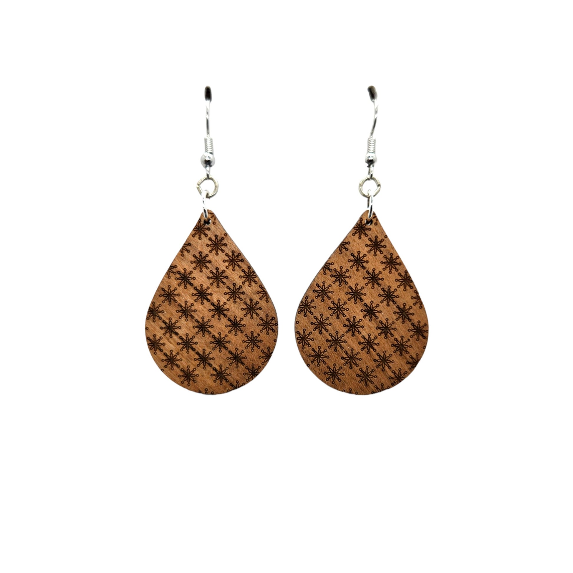 Wood earrings in a teardrop shape engraved with a unique pattern of stars or snowflakes that almost look like asterisks handcrafted in the USA in a small father and daughter wood shop in Northern California.
