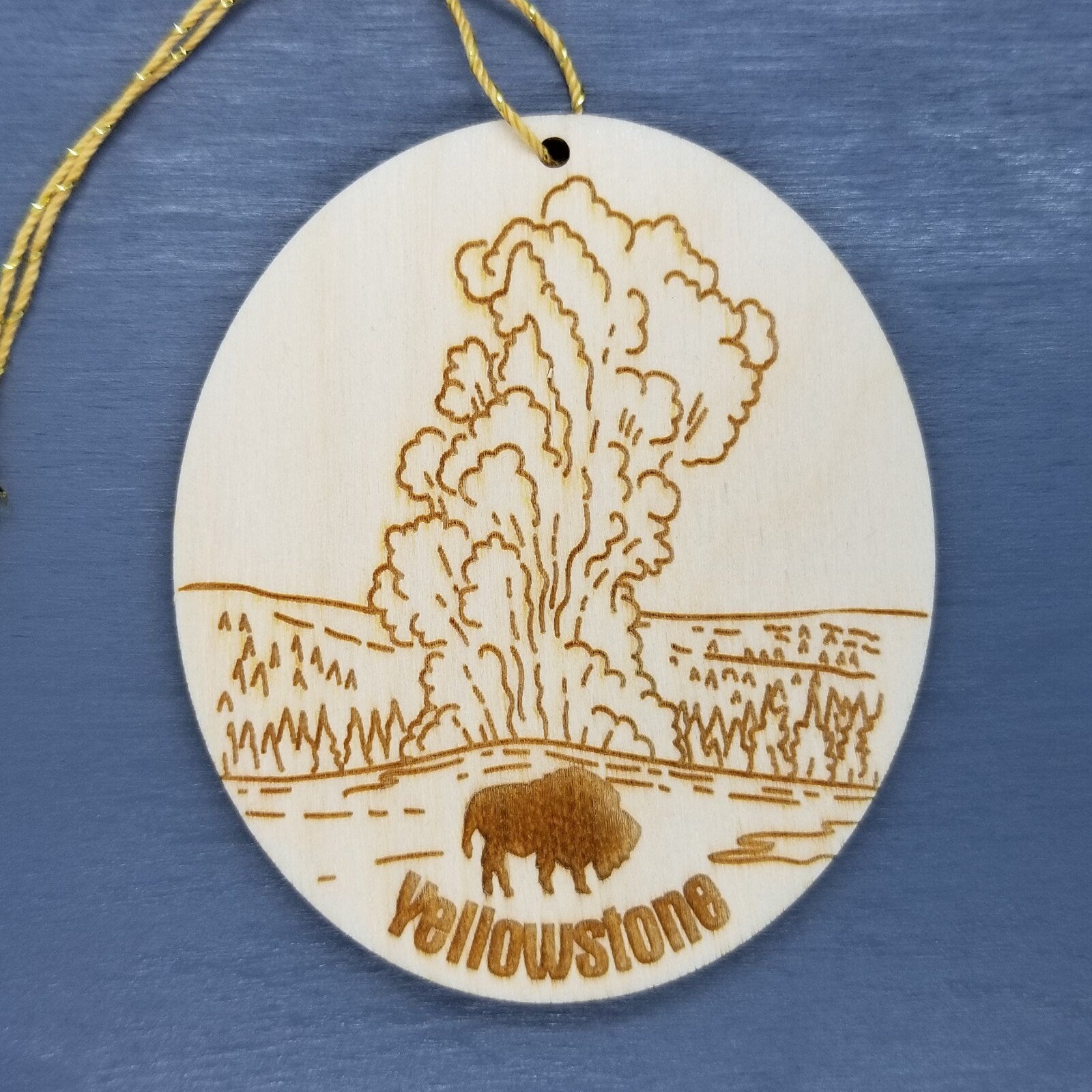 Yellowstone National Park Ornament Old Faithful Geyser Bison Buffalo Handmade Wood Souvenir Made in USA Travel Gift 3 Inch Christmas